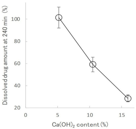 Figure 9 shows the effect of Ca(OH)2 on the RA4 value of KGM matrix tablets. The RA4 value of KGMH matrix tablets decreased significantly with increasing amounts of Ca(OH)2, with values of 101.5%, 59.1%, and 28.6% for KGML120, KGMH120, and KGMH120, respectively.