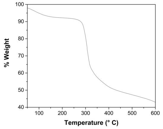 It was obtained by gravimetry that the ChM contained 93.53 ± 0.10% water. Magnetite content of the dry beads was determined by thermogravimetric analysis (TGA). Figure 1 shows the thermal behavior of ChM, where 7.4% mass was lost within 160 °C, attributed to water loss, and 47.6% mass was lost in the 160–560 °C range, which is attributed to the decomposition of the chitosan matrix. From 560 to 600 °C, the decomposition process became slow and only 2.0% mass loss occurred. At 600 °C, 43.0% of the mass of the ChM residue remained. Thus, the magnetite content of the hydrogel ChM beads was of 2.73%, and the chitosan content of the hydrogel beads was of 3.74%.
