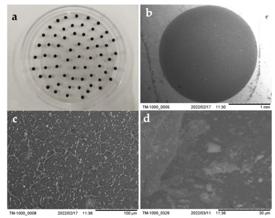 Images of ChM beads obtained (a) with a digital camera. (b–d) with a scanning electron microscope (SEM).