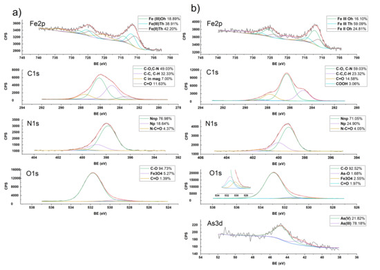 The interactions between chitosan and magnetite in the ChM composite, and ChM-arsenic were characterized by X-ray Photoelectron Spectroctopy (XPS) using a XPS SPECS System (Berlin, Germany), which contains a Phoibos 150 analyzer and a 1D DLD detector. The XPS spectra were obtained with a monochromatic Al Kα source (1486.6 eV) working at 250 W (12.5 kV and 20 mA) and a base pressure of 3 × 10−9 mbar in the analytical chamber. The high-resolution scans were conducted with a pass energy of 15 eV and step sizes of 0.1 eV, using a flood gun source of 20 µA of emission and 2 eV energy to compensate. Data was analyzed with the Analyzer 2.21 software, using Lorentzian–Gaussian curves after background subtraction.