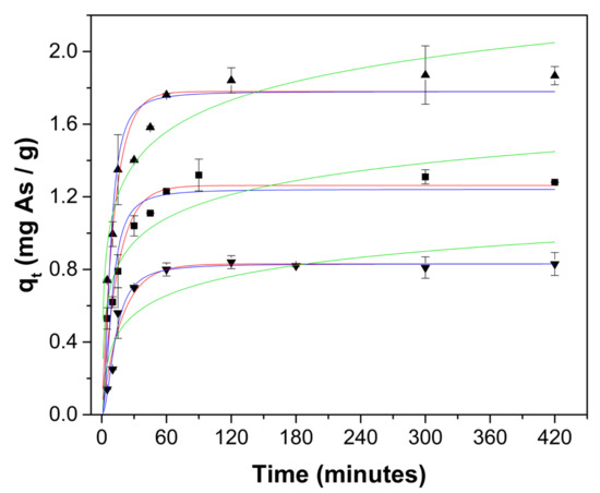 Experimental kinetic data of As adsorption onto ChM hydrogel beads at 25 °C and initial pH = 7.0; using different initial concentrations: 5 mg As/L (▼), 10 mg As/L (■) and (▲) 15 mg As/L. Uptake values predicted by pseudo-first order (—), pseudo-second order (—) and Elovich (—) models.
