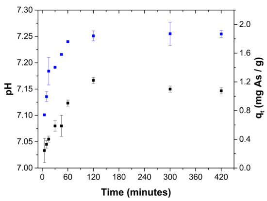 Chitosan-impregnated magnetic Fe3O4 nanoparticles have been studied for arsenic removal from aqueous systems, in a batch system at a pH of 6.8; maximum adsorption capacities of 35.3 and 25.7 mg As/g adsorbent were obtained for As(III) and As(V), respectively [30]. Arsenate was removed from the aqueous system using magnetite in a batch system at an initial pH of 7.9, where a maximum adsorption capacity of 3.65 mg As/g was obtained [6]. Magnetite is an iron oxide that has been an object of interest in water treatment research due to its biocompatibility, low-toxicity, magnetic property, low-cost, and its high affinity to arsenic species [31,32].