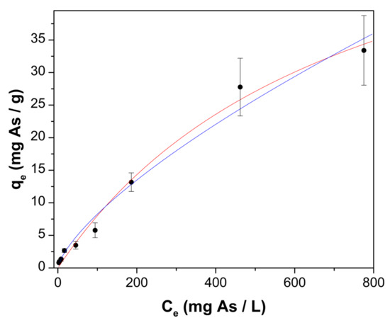 The adsorption isotherm (Figure 6) is L-shaped, without a strict plateau [45]. The isotherm experimental data were fitted by nonlinear regression analysis to the Langmuir (Equation (7)) and Freundlich (Equation (8)) models, since these models are adequate for the analysis of type L isotherms [45]. Table 2 reports the estimated parameters for both models, where higher correlation coefficient values, and lower MAE values, indicate that the Langmuir model best describes the obtained adsorption data. A maximum arsenic uptake capacity of 66.89 ± 8.57 mg As/g was estimated when the initial pH was 7.0.