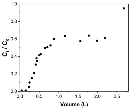 Figure 7 shows that the breakthrough curve has a sigmoidal shape. However, after a volume of approximately 2.3 L has passed through the column, the Ct/C0 ratio increases. The column is considered to reach exhaustion point when a volume of 2.68 ± 0.02 L had passed. Table 5 shows the breakthrough point, which was set when Ct/C0 = 0.05. The number of interstitial bed volumes (NIVBb) passed through the column was 28.2 ± 0.2 and the amount of arsenic adsorbed by the ChM was 1.05 ± 0.01 mg As/g. At exhaustion, (NIVBe) was equal to 315.4 ± 2.8, and the capacity of the column at this point was 5.68 ± 0.10 mg As/g.