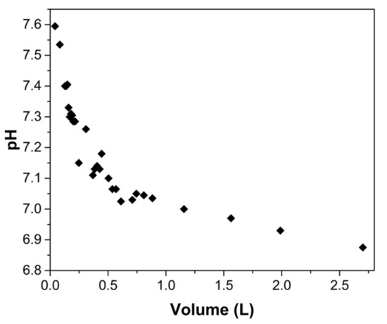 Figure 8 shows the pH of the effluent as it exited the column, where it can be observed that at the beginning of the operation, pH increased rapidly to 7.60 ± 0.04. Throughout the column operation, the pH of the effluent slowly decreased, and at the end of the experiment, the pH was 6.88 ± 0.01. The pH increase is due to the transfer of protons from the solution to the chitosan amine groups. Because of the proton transfer from the incoming solution to the amino groups in ChM, new active sites are continuously generated, which favors the adsorption of arsenic. The effluent pH decreases as the solution enters the column because there are fewer amine groups to protonate. When 2.7 L has passed through the column, protonation is almost non-existent, so the effluent concentration increases rapidly, and the column is exhausted.