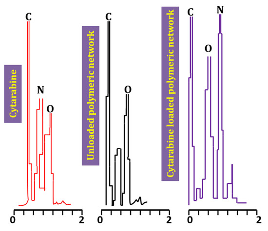 EDX study was carried out to further confirm loading of cytarabine into the developed network by recording and comparing EDX scans of pure cytarabine, blank hydrogels and cytarabine containing hydrogels through scanning electron microscopy equipped with EDX—an Oxford instrument (UK).