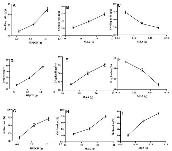 Effect of HPβCD on swelling ratio (A), % drug loading (D), and % gel fraction (G), effect of MAA on swelling ratio (B), % drug loading (E), % gel fraction (H), effect of MBA on swelling ratio (C), % drug loading (F) and % gel fraction (I).