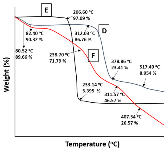 TGA thermograms of HPβCD (D), Cytarabine (E) and Cytarabine-loaded hydrogels (F).