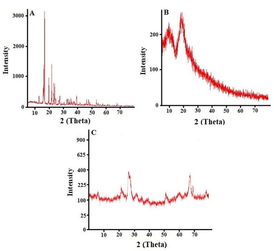 PXRD diffractogram of cytarabine (A), HPβCD (B) and cytarabine-loaded hydrogel network (C).