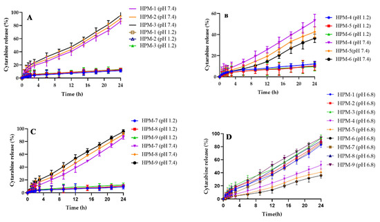Drug release studies (Figure 10) showed different release patterns for cytarabine depending on different components of the formulated hydrogels. Cytarabine release of 86.17–95.47% was measured with increasing content of HPβCD in the developed hydrogel formulations (HPM-1–HPM-3) (Figure 10A). Increase in drug release of 86.67–95.57% (HPM-7–HPM-9) (Figure 10C) was also noticed with an increase of MAA contents when other constituents’ concentrations remained constant. Improvement in drug release with increased concentration of HPβCD and methacrylic acid during preparation of the pH-sensitive hydrogel has already been reported in literature [29,30].