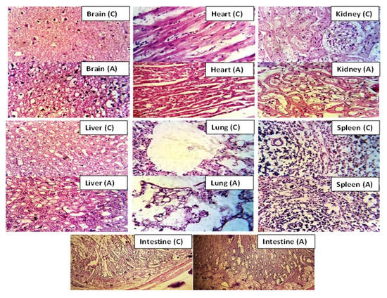 At the end of the 14th day, test animals were reweighed and administered anesthesia (1 mL/kg) containing a mixture of ketamine and xylazine (70:30). Hematological samples were withdrawn from the jugular vein and transferred immediately into EDTA tubes. Rabbits were sacrificed and vital organs were removed for histopathological examination, properly washed and transferred to a container having 10% formalin as a preservative solution [36].
