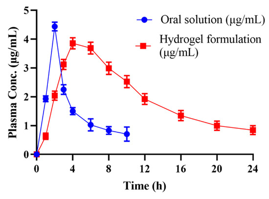 Combined plasma concentration graph of pure cytarabine powder solution and cytarabine-loaded hydrogel formulation after oral administration.