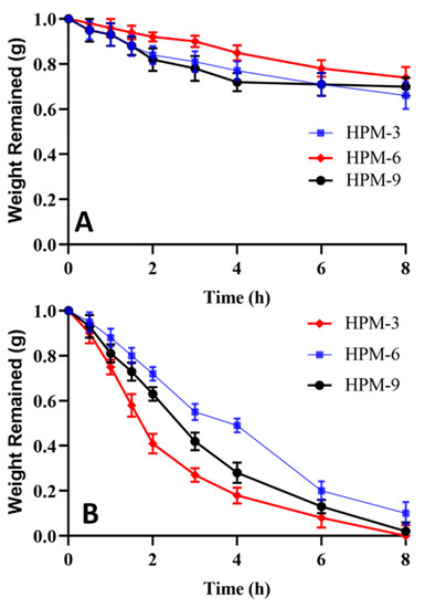 Developed hydrogels exhibited variable degradation behavior in AGF (pH 1.2) and AIF (pH 6.8). At pH 1.2, hydrogels presented hydrophobic character due to lack of ionization of carboxylic groups of MAA and hence minimal degradation occurred. Formulation having optimum MBA content (HPM-6) showed only 0.26 g weight loss in 8 h studies at AGF. On the other hand, slightly higher weight loss was recorded in the case of the formulation (HPM-9) having optimum content of MAA. While in the case of HPβCD (HPM-3) weight loss was only 0.34 g. Results are shown in Figure 13A. These results suggested that as there was negligible swelling at acidic pH, thus the least weight was wasted and maximum weight remained intact.