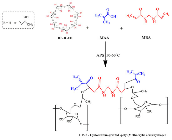 Aqueous polymerization involving free radical exchange was used to develop various hydrogel preparations. A weighed amount of HPβCD (Table 6) was dissolved in 25 mL freshly prepared distilled water with constant stirring at room temperature on a hot plate. A pre-weighed quantity of ammonium per-sulfate (APS) was dissolved in a specific quantity of water and poured dropwise into the HPβCD solution while on the hot plate stirrer. An amount (Table 1) of methacrylic acid (MAA) was added drop wise to the above mixture. Finally, an aqueous solution of MBA was transferred slowly to the polymer-monomer mixture. The resultant solution was sonicated for at least 3–5 min to remove entrapped air. The clear solution was transferred to test tubes which were closed with aluminum paper. Test tubes were vertically racked on a steel test tube stand and the entire setup was translocated into a water bath. Initially the temperature was kept at 45 °C for 2 h followed by incremental rises in temperature, i.e., 50 °C for 2 h and finally 60 °C for 12 h. Afterwards, test tubes were allowed to cool and newly formed rod like hydrogels were removed with the help of a spatula from the test tubes. The developed hydrogels were sliced into small discs of almost 9 mm length by using a sharp-edged blade. Hydrogel discs were dipped in equimolar contents of water and alcohol (50:50) in order to remove non-reactive agents. After thorough washing, drying of discs was performed in a dry heat oven at 40 °C. After complete drying, dried hydrogel discs were stored in an airtight polyethylene plastic bag for further use [34]. The proposed schematic presentation of HPβCD-grafted-poly (MAA) hydrogels is shown in Figure 14.