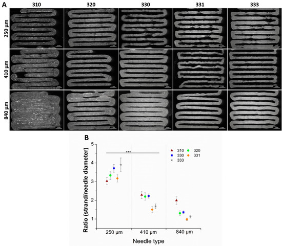 Optical images of single layer printed blends having 9 strands with a pre-set strand distance of 1.5 mm (A). Ratio of the measured strand diameter to needle diameter (scale bar = 2 mm) (B). Strand diameters are measured from the respective pictures at 20 different positions of single layer scaffold (n = 20, mean ± SD, *** p < 0.005).