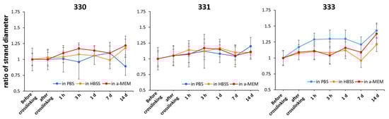 Change in the strand diameter of scaffolds over 14 days when incubated in PBS, HBSS, and α-MEM; expressed as a ratio of strand diameter at particular time point to strand diameter before crosslinking (n = 40, mean ± SD).