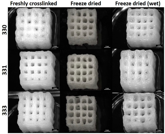 Images of 30 layered scaffolds obtained from a stereomicroscope taken immediately after crosslinking, freeze drying, and incubating the freeze dried scaffold in HBSS for 12 h (scale bar = 2 mm).