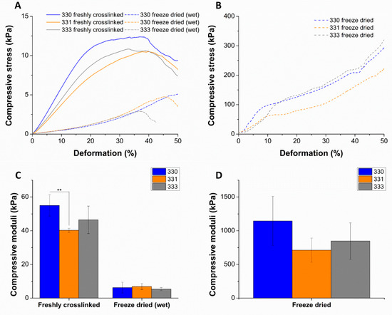 Representative plots of compressive stress vs. deformation as a result of uniaxial compression tests performed on scaffolds that were freshly crosslinked, freeze dried (wet) (A), and freeze dried (B). Compressive modulus determined from the slope of the curve till 10% deformation (C,D) (n = 4, mean ± SD, ** p < 0.01). The significant differences in the mechanical properties of freshly crosslinked, freeze dried (wet) scaffolds in comparison to freeze dried scaffolds can be noted with the scale of y-axis in the plots.