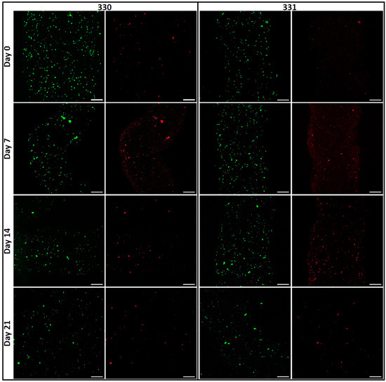 The blends 330 and 331 were used for performing bioprinting studies as these blends showed lowest swelling in α-MEM and were stable over a period of at least 14 days. To assess the suitability of these blends as bioinks—i.e., their ability to support cells when bioprinted—human telomerase reverse transcriptase (hTERT) expressing mesenchymal stem cells (MSCs) were mixed in them (at cell density of 5 × 106 cells per gram of blend) and bioprinted in sterile conditions. As the hTERT-MSC’s can differentiate into osteogenic, chondrogenic, and adipogenic lineages [34]; cell-laden scaffolds can potentially be used for musculoskeletal tissue engineering. As an initial step in this direction, viability and proliferation of hTERT-MSC’s in GG scaffolds was evaluated by live/dead assay and by quantifying intracellular lactate dehydrogenase (LDH), respectively. Live/dead assay performed on the bioprinted scaffolds revealed a marginally higher cell viability in 330 blend (86.63 ± 3.10%) compared to 331 blend (84.62 ± 1.61%) immediately after completion of bioprinting (Figure 6 and Figure 7A). Later, decrease in cell viability till 14 days was observed for both the blends (i.e., 68.82 ± 2.52% and 64.91 ± 3.73% for 330 and 331 blends, respectively). However, an increase in cell viability was observed after 21 days compared to cell viability after 14 days (72.78 ± 2.54% and 72.21 ± 2.69% for 330 and 331 blends, respectively).