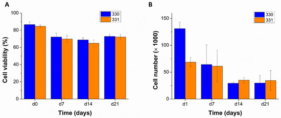 Viable cell numbers in the bioprinted scaffolds, quantified by LDH activity measurements also showed a decrease till 14 days (Figure 7B). Low cell number measured in 331 scaffolds compared to 330 scaffolds at day one might be due to inhomogeneous mixing of the cells in the blend—as the cell suspension was mixed by hand using a spatula. To achieve uniform distribution of cells in the ink, a cell mixer unit [37] can be used prior to 3D bioprinting in the future. The measured cell numbers after 21 days of culture were similar to cell numbers after 14 days—supporting the observations made in live/dead assays. The decrease in cell viability of hTERT-MSCs in GG was in accordance to the work of Giglio et al. [38] where they used low acyl GG for cell encapsulation and reported a progressive decrease of cell viability from 78 to 68% from day one to day seven, respectively. Interestingly, higher cell viability of cells was reported in GG crosslinked with strontium ions compared to calcium ion crosslinked GG. Also, higher osteogenic differentiability of hTERT-MSCs in strontium crosslinked GG was observed, indicating that strontium ions facilitated cell viability and functionality of the encapsulated cells in GG. Different mechanical properties of strontium and calcium ion crosslinked GG gels are speculated to be the reason for the difference in encapsulated hTERT-MSCs response. In the current work, it can be speculated that lack (in case of 330) or insufficiency/inaccessibility (in case of 331) of cell adhesion sites and calcium crosslinking [38] resulted in round morphology of the encapsulated cells. Due to the uncharacteristic morphology of the hTERT MSCs, might have led to apoptosis over time.
