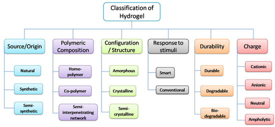 Hydrogels can be classified on the basis of source/origin, polymeric composition, structure/configuration, response to stimuli, durability, network electrical charge, and on the basis of cross-linking. These classifications are given in Figure 1, and discussed one by one in the following.
