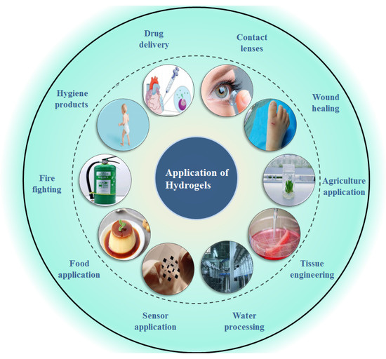 Due to the advantages of hydrogels over other types of biomaterials, including their good swelling behavior and mechanical strength, increased biocompatibility, tunable biodegradability and low toxicity, they have been widely used in the fields of wound healing, tissue engineering, water processing, agricultural application, food applications, sensor applications, firefighting and other applications [92] (absorbent hygiene products and contact lenses), as shown in Figure 2. Besides this, they have also been broadly applied in the field of drug delivery, which will be discussed separately in the next section. In this section, the recent advances in the use of hydrogels in the aforementioned applications will be reviewed.