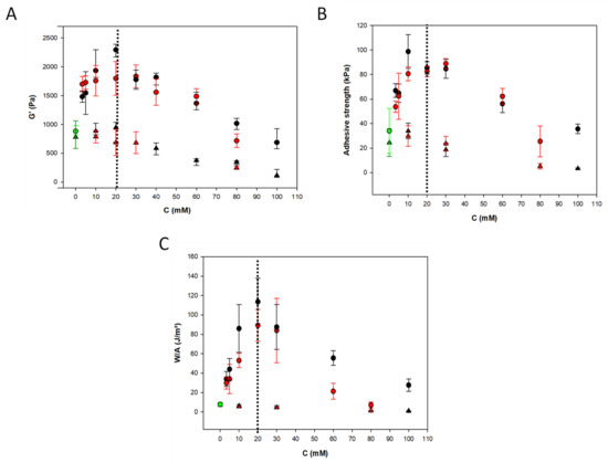 2.2. Influence of the Catechol and Dopamine Concentration on the Gels’ Elasticity and Adhesiveness