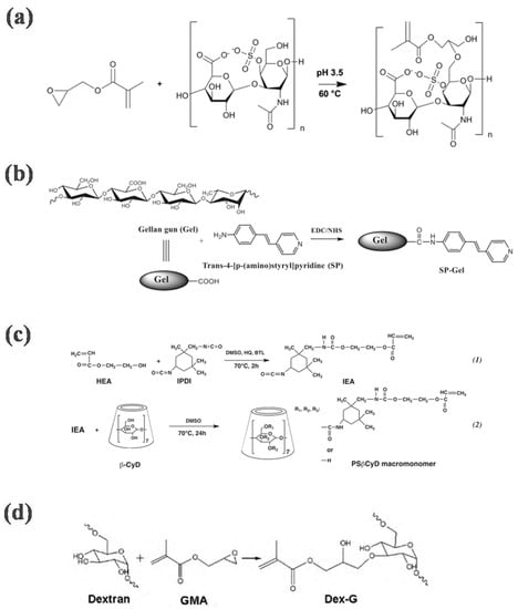 - Ornell, K.J.; Lozada, D.; Phan, N.V.; Coburn, J.M. Controlling methacryloyl substitution of chondroitin sulfate: Injectable hydrogels with tunable long-term drug release profiles. J. Mater. Chem. B 2019, 7, 2151–2161. [Google Scholar] [CrossRef] [PubMed]
