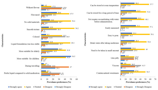 Flavored liquid formulations (74.1%) with smooth textures (69.1%) and an absence of solid materials (65%) were the preferred formulations. Natural flavors, such as bee honey, were preferred over synthetic (78.1%) flavors. The formulations were also preferred if reconstitution was not required (81.4%) and if they could be taken in small doses (70.8%). However, almost half of the respondents preferred to take solid medicines, such as tablets or capsules, compared to liquid medicines (46.9%), particularly while travelling (71.1%). The preferred characteristics of the liquid formulation are shown in Figure 1. Overall, the mean score (±SD) of positive preferences toward the liquid formulation was 71.6 ± 0.3%, regardless of the social demography. However, there was no significant difference between age groups (p = 0.949), gender (p = 0.253), occupation (p = 0.246), and monthly income (p = 0.417) in terms of the preference toward liquid formulations. The preferences, according to the respondents’ social demography, are listed in Table 2.