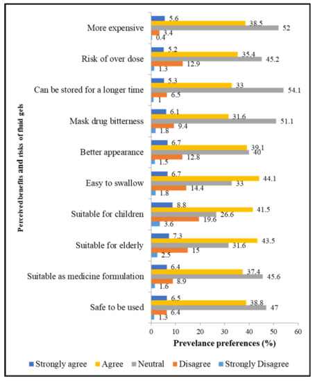 The third section of the questionnaire focused on the factors that influence the preferences toward liquid formulations for medicine, using yes or no answers. Finally, the fourth section of the questionnaire asked about the perceived benefits and risks of the newly developed fluid gels on the basis of a five-point Likert scale (from 1 = strongly disagree to 5 = strongly agree). The scores were taken from the sum of the answers to all the items. As all the statements were positively worded, except for the risk-related questions (9 and 10 (reversed scale)), low scores signified the negatively perceived benefits and risks of the fluid gel, whereas high scores indicated the positively perceived benefits and risks. All questions were developed and/or adapted from previous studies [3,6,8].