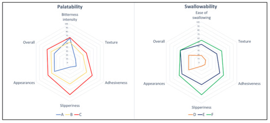 Radar charts for bitterness intensity/ease of swallowing, texture, adhesiveness, slipperiness, appearance, and overall, for fluid gels. Each sensory item is described by its population mean for the 100 mm visual analogue scale (VAS), where 0 is the lowest possible intensity of the stimulus, and 100 is the highest.