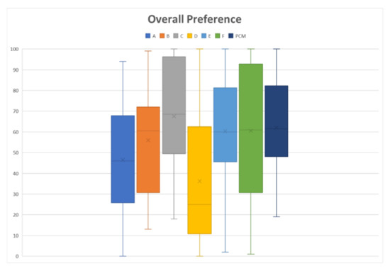Overall preference toward fluid gel formulation, where 0 is “Extremely like” and 100 is “Extremely dislike”. Paracetamol (PCM) acts as a control, which is a perception when taking marketed paracetamol suspension/syrup. Fluid gels formulated with different consistency were assigned as samples A and D (thin liquid), B and E (mildly thickened liquid), and C and F (highly thickened liquid).
