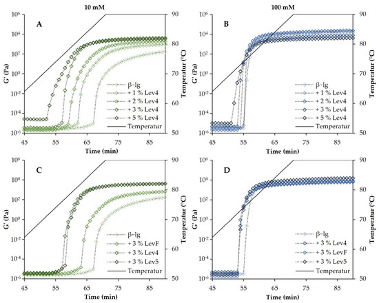 The temperature sweeps of β-lg gels and mixed gels with varying contents of the high molecular weight levan Lev4 (2.0 × 108 Da) and salt concentration are shown in Figure 1. The gelation of β-lg varied considerably with the salt concentration. For the 10 mM β-lg gels, the onset of gelation (initial increase of the storage modulus G′) occurred later and more time was needed to reach a constant value of G′ compared to the 100 mM β-lg gels. For the 100 mM, β-lg gels, the gel point temperature (crossover of G′ and G″) was reached at 76.7 ± 0.1 °C, whereas for 10 mM β-lg gels a holding time of 2.9 ± 0.9 min at 90 °C was necessary after the maximum temperature of the heat ramp has been reached (Figure 2). Electrostatic interactions play a significant role in the gelation of whey proteins, such as β-lg. By varying the pH value and ionic strength, electrostatic forces, and therefore, the gelling mechanism and the resulting gel properties can be influenced [19]. The 10 mM β-lg samples formed fibrillar networks and the gelation occurred at higher temperatures [18,40]. At 100 mM a particle network was formed. The difference in the gelation is caused by the electrostatic shielding of the salt ions. Without heat denaturation, β-lg molecules in 10 mM repel each other due to predominant electrostatic interactions, whereas in 100 mM an equilibrium between attractive and repulsive electrostatic interactions is reached [1]. The heat treatment causes the unfolding of the proteins. Therefore, the hydrophobic core is exposed and thus enables protein aggregation [41]. At low ionic strengths, the repulsive electrostatic interactions between the negatively charged β-lg molecules must be overcome, and therefore, the proteins form an extended, fibrillar network and the aggregation occurs at higher temperatures. At high ionic strengths due to charge shielding, the proteins first aggregate into colloidal particles, which further aggregate into fractal gel networks [40,42,43]. Due to the shielding of the negative charges of the protein, the network formation at 100 mM occurred faster and at a lower temperature than the gelation of the 10 mM β-lg gels.