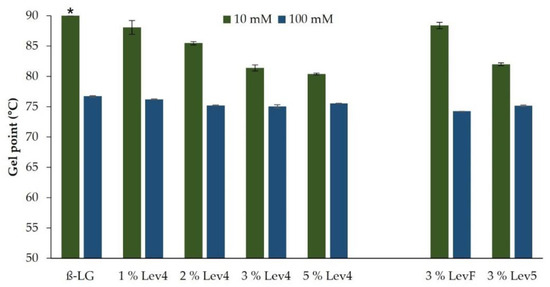 The molecular weight of levan affected the heat-induced gelation of the mixed gels depending on the NaCl concentration. In 10 mM solutions, the onset of gelation occurred sooner the higher the molecular weight. The storage modulus of the mixed gels containing the high molecular weight levan Lev4 (2.0 × 108 Da) and Lev5 (6.5 × 108 Da) increased earlier compared to the low molecular weight LevF (1.4 × 106 Da). In addition, a constant value of G′ was reached earlier for the mixtures containing Lev4 and Lev5. The gel point as a function of the molecular weight is displayed in Figure 2 (right panel). For the 10 mM mixtures, a decrease of the gel point from 88.4 ± 0.5 °C (LevF) to 81.4 ± 0.5 °C (Lev4) and 82.0 ± 0.2 °C (Lev5) was observed. By contrast, in the 100 mM mixtures, no effect of the molecular weight on heat-induced gelation was observed. Regardless of the molecular weight, the onset of gelation started slightly earlier if levan was added. The gel point of the 100 mM mixtures dropped by 1.5 to 2.5 °C in the presence of levan (LevF: 74.2 ± 0.0 °C, Lev4: 75.1 ± 0.3 °C, Lev5: 75.2 ± 0.1 °C). The molecular weight dependency of the mixed gels is most likely caused due to the excluded volume effect. At the beginning of the protein aggregation, the levan molecules were significantly larger than the β-lg monomers or dimers. Since the excluded volume effect is more pronounced the higher the molecular weight difference between two polymer species is, the initial effects of segregation were more pronounced the higher the molecular weight of the levan. Therefore, β-lg mixtures with high molecular weight levan formed gels more rapidly and at lower contents compared to mixtures containing low molecular weight levan. This correlation was also shown for other segregative interacting mixed gels [45,46].