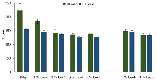 The influence of the salt concentration and the addition of levan on the relaxation times T2 of the heat induced β-lg gels can be seen in Figure 3. The relaxation time T2 is related to protons (1H) with defined rotational mobilities, which can be referred to as the water population within the β-lg gels. An increase in the relaxation time T2 means a higher mobility of the water within the gel structure and a less strong water binding. The T2 of the 10 mM β-lg gel and the 100 mM β-lg gel indicated a stronger water binding at a higher salt concentration. This correlated with the gel point temperature. The stronger the water binding in the gel was, the lower was the gel point temperature during the heat treatment. Furthermore, propositions on the gel strength can be made by determining the relaxation behavior of the samples, since network formation and water binding are mutually dependent as shown in other studies [54,55,56].