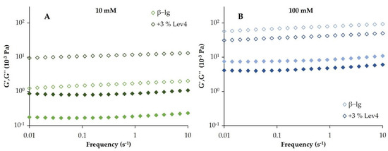 Frequency sweep of the pure β-lg gel (lighter colors) and the β-lg gel containing 3 wt% Lev4 (darker colors) at 10 mM (A) and 100 mM (B) NaCl. Filled symbols indicate the loss modulus (G″) and open symbols indicate the storage modulus (G′).