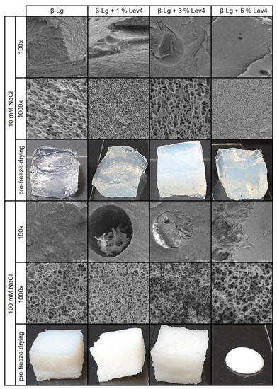 SEM images and photographs of the mixed β-lg gels containing different Lev4 contents in 10 mM and 100 mM NaCl. SEM images at 100× magnification focus on phase-separated regions, if present, and SEM images at 1000× magnification are focused on the con.