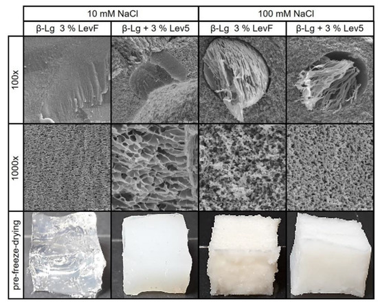 The microstructure and the optical images of the β-lg gels and the mixed gels containing Lev4 are shown in Figure 5. SEM images at 1000× magnification display the structure of the continuous β-lg network. The optical appearance can be linked to the gel structure. The fibrillar β-lg gel at 10 mM was transparent since the diameter of the gel strands was in the nm range [20]. A particle network with an opaque appearance was formed at 100 mM because the dimensions of the aggregates were within the µm range [61]. The SEM images of both β-lg gels showed a porous structure that was similar in size but differed in the regularity of the structural elements. It should be noted that the freeze and the freeze-drying process might have affected the structure of the β-lg networks. Therefore, differences between the gels may not only be attributed to the different formulations but also to the alteration of the network structure during preparation.
