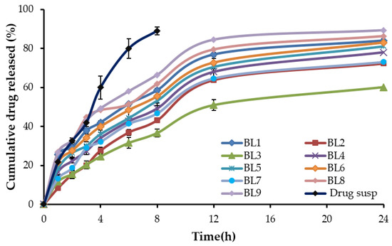 In vitro drug release pattern of CRV-loaded bilosomes, as well as free drug, are depicted in Figure 1. As shown in Figure 1, the rate of drug released from free CRV suspension was significantly higher than the investigated bilosomal formulations (p < 0.05). In addition, all bilosomal formulations exhibited biphasic release profiles with a rapid initial drug release in the first 3 h (ranging from 20.03 to 44.67%), followed by a sustained release profile till 24 h. The cumulative percentage release of CRV from bilosomes ranged from 60.12% (BLS3) to 89.3% (BLS9) after 24 h. The initial fast release of CRV from bilosomal formulation might be attributed to the presence of drug in the outer shell of the bilosome vesicles [32]. The impact of different formulation variables—namely, lipid concentration and cholesterol concentration—on the in vitro drug release from formulated bilosomes was also investigated. It was obvious that increasing lipid concentrations had a positive effect on the percentage of drug release from BLS. This effect might be ascribed, on the one hand, to the amphiphilic properties of the soya bean phosphatidylcholine, and on the other hand, to the negative effect of increasing lipid concentration on the vesicle size. In contrast, cholesterol concentration did not significantly affect the in vitro drug release pattern from the prepared bilosomal formulations (p = 0.894).