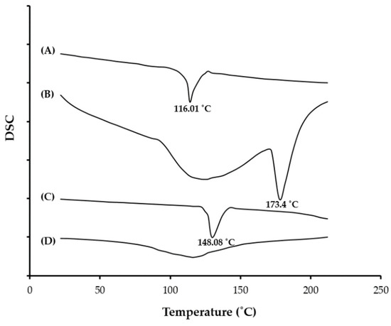 DSC thermograms of (A) pure carvedilol; (B) Soybean phosphatidylcholine; (C) Cholesterol and (D) optimized bliosomal formulation (BLS9).
