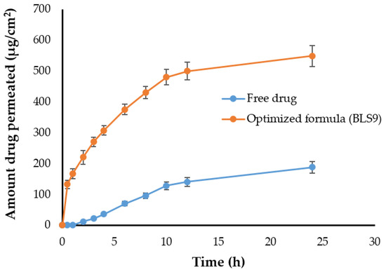 The ex-vivo permeation study of CRV from optimized bilosomal vesicles and CRV aqueous suspension was conducted using sheep buccal mucosa. As shown in Figure 4, encapsulation of CRV in bilosome vesicles leads to a significant permeation improvement (p < 0.05) across the mucosal membrane relative to the control CRV suspension with a three-fold increase in the transdermal flux (Jmax). Jmax of optimized bilosomal formulation was 22.82 ± 0.41 μg/cm2/h across sheep buccal mucosa, as compared to CRV aqueous suspension (7.83 ± 0.11 μg/cm2/h). This significant increase in transdermal flux of bilosomes might be attributed, on the one hand, to the small vesiclular size of CRV-loaded bilosomes, along with high phospholipids content, which increases the affinity of bilosomes to the biological membranes, thus increasing its permeation [34], and on the other hand, to the existence of bile salt that might help the permeation of the drug by opening the tight junction of the membrane [35]. Various permeation parameters through sheep buccal mucosa, were calculated and summarized in Table 2.