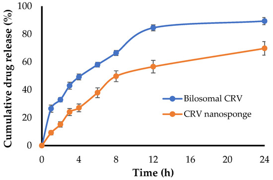 In vitro release profile of CRV from CRV-loaded bilosomes and CRV-loaded nanosponge. Data represents mean ± SD.