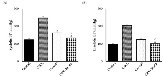In order to assess the pharmacological efficacy of the CRV nanosponge, the hypotensive potential of CRV was challenged against CdCl2-induced hypertension in rats. Hypertension was induced by intraperitoneal injection CdCl2 into rats for 14 days. Then, animals were treated with either CRV nanosponge or a commercially available marketed product (Carvid®, MULTI-Apex Pharma, Alexandria, Egypt) for two weeks. Finally, the systolic and diastolic blood pressures were recorded by the tail cuff method. As illustrated in Figure 7, intraperitoneal injection of CDCl2 for 14 consecutive days resulted in a significant increase in both systolic and diastolic blood pressure, compared to the negative control group. Treatment with either CRV nanosponge or commercially available marketed product (Carvid®) significantly lowered both systolic and diastolic blood pressure, compared to CdCl2-treated animals. Of interest, superior to Carvid®, CRV nanosponge was efficient in reducing both systolic and diastolic blood pressures to the normal control level. These results suggest the efficacy of CRV nanosponge in mitigating the blood pressure in hypertensive rats, to the near-normal control level.