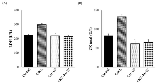 Effect of cadmium exposure and carvedilol bilosomes loaded sponge on cardiac biomarkers; (A) Serum lactate dehydrogenase (LDH); and (B) Serum creatine kinase (CK). * p < 0.05 vs. CdCl2-intoxicated rats.