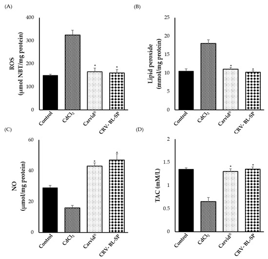Effect of cadmium exposure and carvedilol bilosomes loaded sponge on oxidative stress markers levels; (A) reactive oxygen species (ROS); (B) lipid peroxidation (LPO); (C) nitric oxide (NO) and (D) total antioxidant capacity (TAC). * p < 0.05 vs. CdCl2-intoxicated rats.
