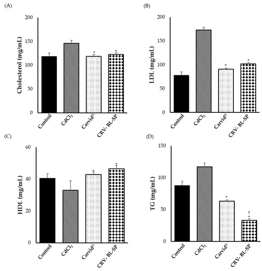 Recent studies have revealed novel properties of carvedilol, which may function to protect the vasculature and heart chronic pathological conditions such as atherosclerosis. In the current study, therefore, the lipid profile (cholesterol, low density lipoprotein (LDL), high density lipoprotein (HDL) and triglycerides (TG)) was assessed in the serum of different treated groups. As shown in Figure 10, cholesterol, LDL, HDL and TG levels in serum showed significant elevations (p < 0.05) in the CdCl2-treated rats, compared to normal ones. On the contrary, treatment with either CRV nanosponge or commercially available marketed product (Carvid®) significantly reduced Cholesterol, LDL, and TG levels, while increasing the levels of HDL, compared to the CDCl2-treated group. The efficacy of CRV nanosponge in lessening the levels of cholesterol, TG, and LDL while increasing the levels of HDL, might be ascribed to the ability of carvedilol to inhibit the oxidation of LDL, preventing the creation of oxidized-LDL, which is thought to promote the development of atherosclerotic plaque [45], and thus protects vascular endothelial from damage.