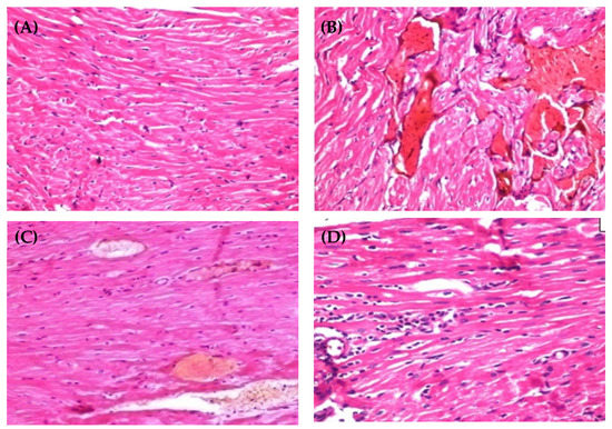 Histopathological sections of heart tissue of (A) control group, (B) CdCl2-intoxicated group, (C) Carvid®-treated group and (D) CRV nanosponge-treated group.