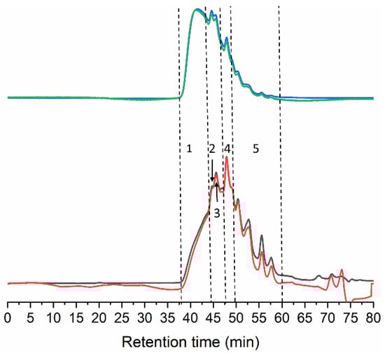 GPC eluograms of gelatin extracted from the skin of tuna. Blue line: right angle light scattering; green line: low angle light scattering; red line: refractive index; black line: ultraviolet (280 nm).