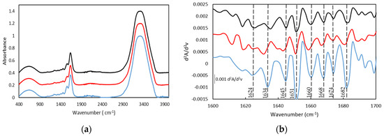 Similarly to other fish gelatins, the FTIR spectra of both gelatin and the gelatin hydrogel are characterized by the main amide bands, such as the Amide I band in the frequency range of 1640–1630 cm−1, Amide II in the range of frequency of 1560–1540 cm−1, and the band in the range of frequency of 1238–1244 cm−1 assigned to Amide III (Figure 4a and the second derivative method Figure 4b and Table S1) [23,42,43,44,45].