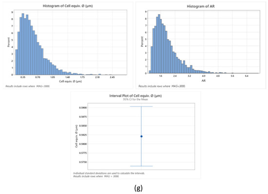 Cryo-scanning electron microscopy of Tuna gelatin hydrogel at different magnifications: (a) ×1000, (b) ×2000, (c) ×5000, (d–f) ×3000. (g) Statistical analysis of cell size-distributions and cell aspect-ratio distributions obtained from the three micrographs captured at X3000 magnification (average of three results).